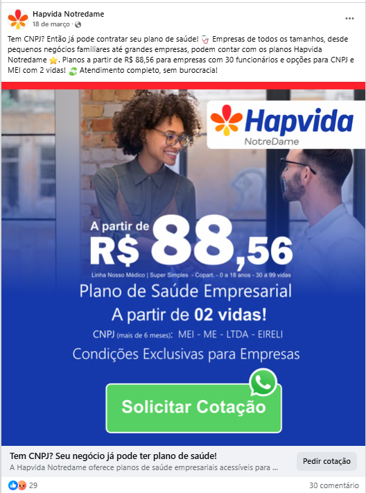 Tem CNPJ? Então já pode contratar seu plano de saúde! 🩺 Empresas de todos os tamanhos, desde pequenos negócios familiares até grandes empresas, podem contar com os planos Hapvida Notredame ⭐. Planos a partir de R$ 88,56 para empresas com 30 funcionários e opções para CNPJ e MEI com 2 vidas! 🍃 Atendimento completo, sem burocracia!